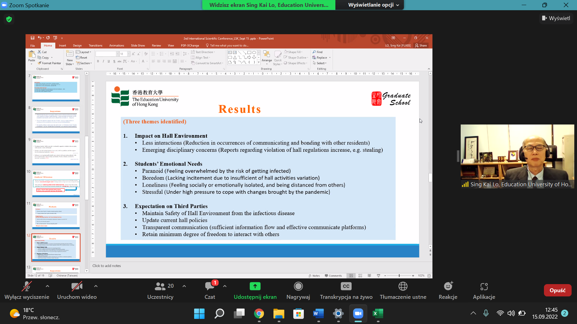 Konferencję otworzyła Pani Profesor Izabella Łęcka, Przewodnicząca Komitetu Naukowego, wraz z Panem Profesorem Michałem Marczakiem, Przewodniczącym Komitetu Naukowego. Pan Profesor wygłosił referat nt. „Suddenly changing conditions — variability of modeling and observation scales in Health Care, który był wprowadzeniem do cyklu prezentacji związanych z aktualną sytuacją placówek ochrony zdrowia w Polsce i kładł nacisk na podejście i metody zarządzania w sektorze ochrony zdrowia w warunkach zmian. Wystąpienie pierwszego prelegenta — Pana Profesora Michała Krzyżanowskiego nawiązywało do problemów i wyzwań związanych z zanieczyszczeniami i zdrowiem w kontekście Europejskiego Zielonego Ładu. Następnie Pani Doktor Paloma Cuchi, przedstawicielka WHO w Polsce, w swoim wystąpieniu, zwróciła uwagę na kontekst międzynarodowych wyzwań zdrowotnych i opieki medycznej w dynamicznie zmieniającym się otoczeniu. Pan Profesor Sing Kai Lo z Education University of Hong Kong, zaprezentował perspektywę dotyczącą potrzeb oraz możliwych działań wspierających przede wszystkim uczniów i nauczycieli podczas, i po wybuchu epidemii Covid-19, w wystąpieniu „Health and Wellbeing of Students and Teachers during Infectious Disease Outbreaks: A “Needs and Supports” Perspective”.
