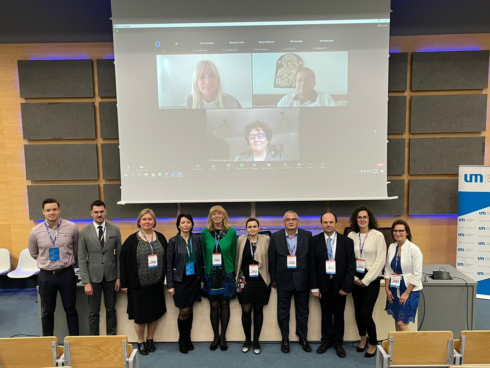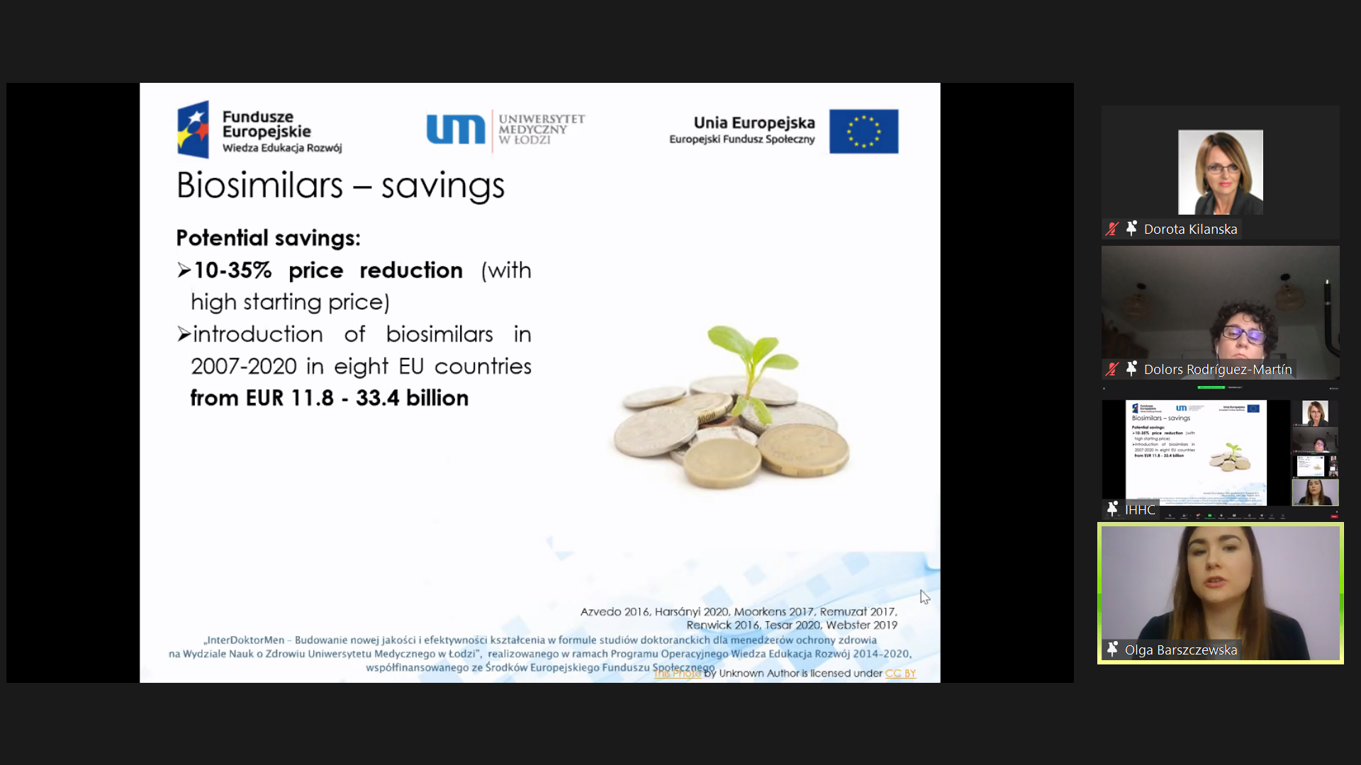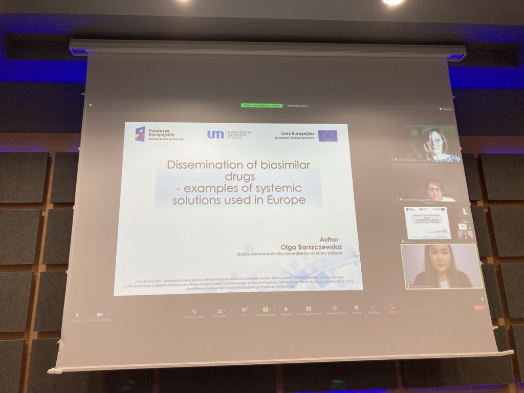 Konferencję otworzył Pan Profesor Remigiusz Kozłowski, Przewodniczący Rady Programowej studiów doktoranckich w ramach Projektu InterDoktorMen. W sesji pierwszej referaty przedstawili: Pani Karolina Kamecka, „Telemedicine technologies partial selection for the posthospital patient care process after total hip arthroplasty – the use of Google Search tool in scientific research”, Pani Olga Barszczewska: “Dissemination of biosimilar drugs — examples of systemic solutions used in Europe”, Pani Maria Belcarz: “Nosocomial infections in the surgical ward — case report and literature review” oraz Pan Jakub Ratajczak “Impact of COVID-19 pandemic on cancer treatment in urology”. Moderatorkami sesji była Pani Profesor Dorota Kilańska i Pani Doktor Dolors Rodriguez Martin.