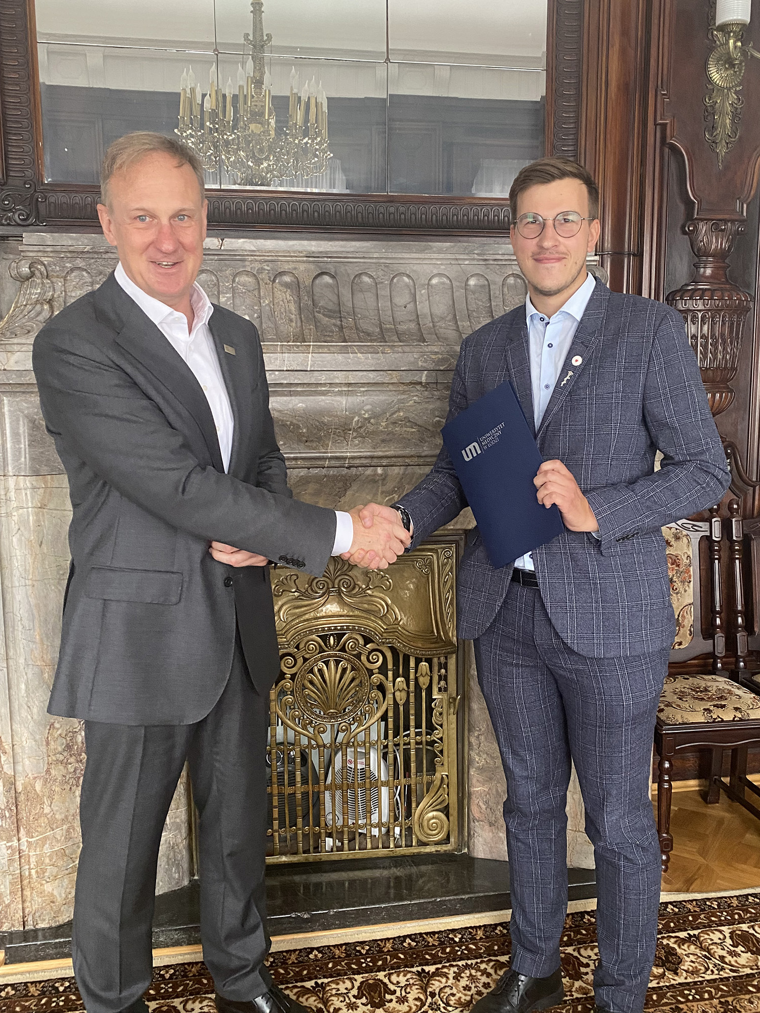 Pod­czas spo­tka­nia 11 wrze­śnia br. JM Rek­tor, prof. dr hab. n. med. Janusz Pie­kar­ski, w imie­niu władz Uczel­ni, zło­żył ser­decz­ne podzię­ko­wa­nia Paw­ło­wi Bol­li­no­wi — byłe­mu Prze­wod­ni­czą­ce­mu Uczel­nia­nej Rady Samo­rzą­du Stu­den­tów — za zaan­ga­żo­wa­nie, odpo­wie­dzial­ność i wkład w roz­wój spo­łecz­no­ści aka­de­mic­kiej Uni­wer­sy­te­tu, pra­cę nad budo­wa­niem dia­lo­gu mię­dzy stu­den­ta­mi a wła­dza­mi uczel­ni oraz aktyw­ne wspar­cie ini­cja­tyw stu­denc­kich.