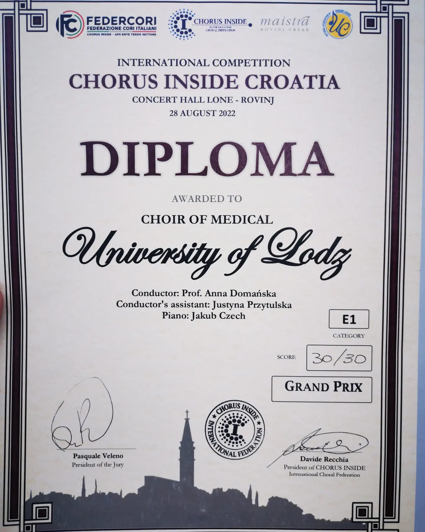 Chór Uniwersytetu Medycznego w Łodzi pod dyrekcją prof. Anny Domańskiej w dniach 23–30 sierpnia 2022 wziął udział w Międzynarodowym Konkursie Chóralnym “Chorus Inside Croatia”, który odbył się w miejscowości Rovinj w Chorwacji. Międzynarodowe jury wyróżniło nasz Chór Złotym Dyplomem w kategorii muzyki Sakralnej, Złotym Dyplomem w kategorii Pop/Modern oraz Grand Prix całego konkursu!