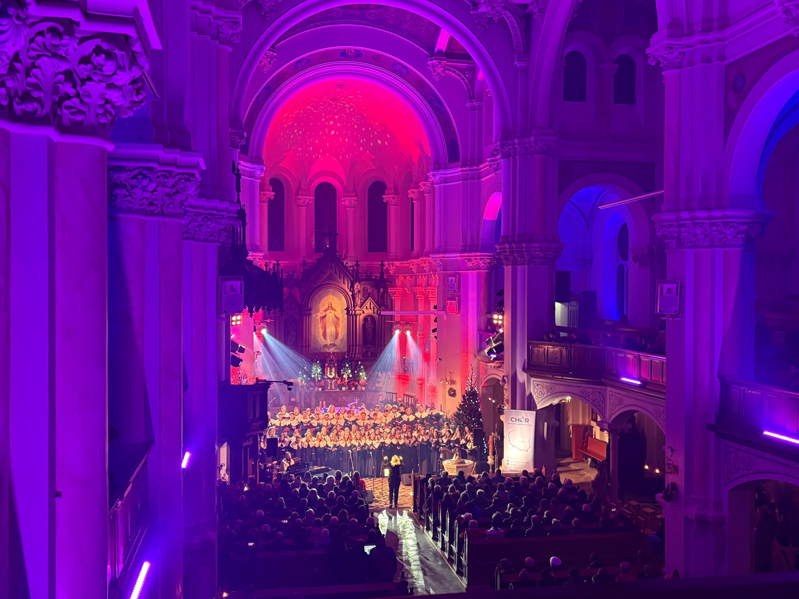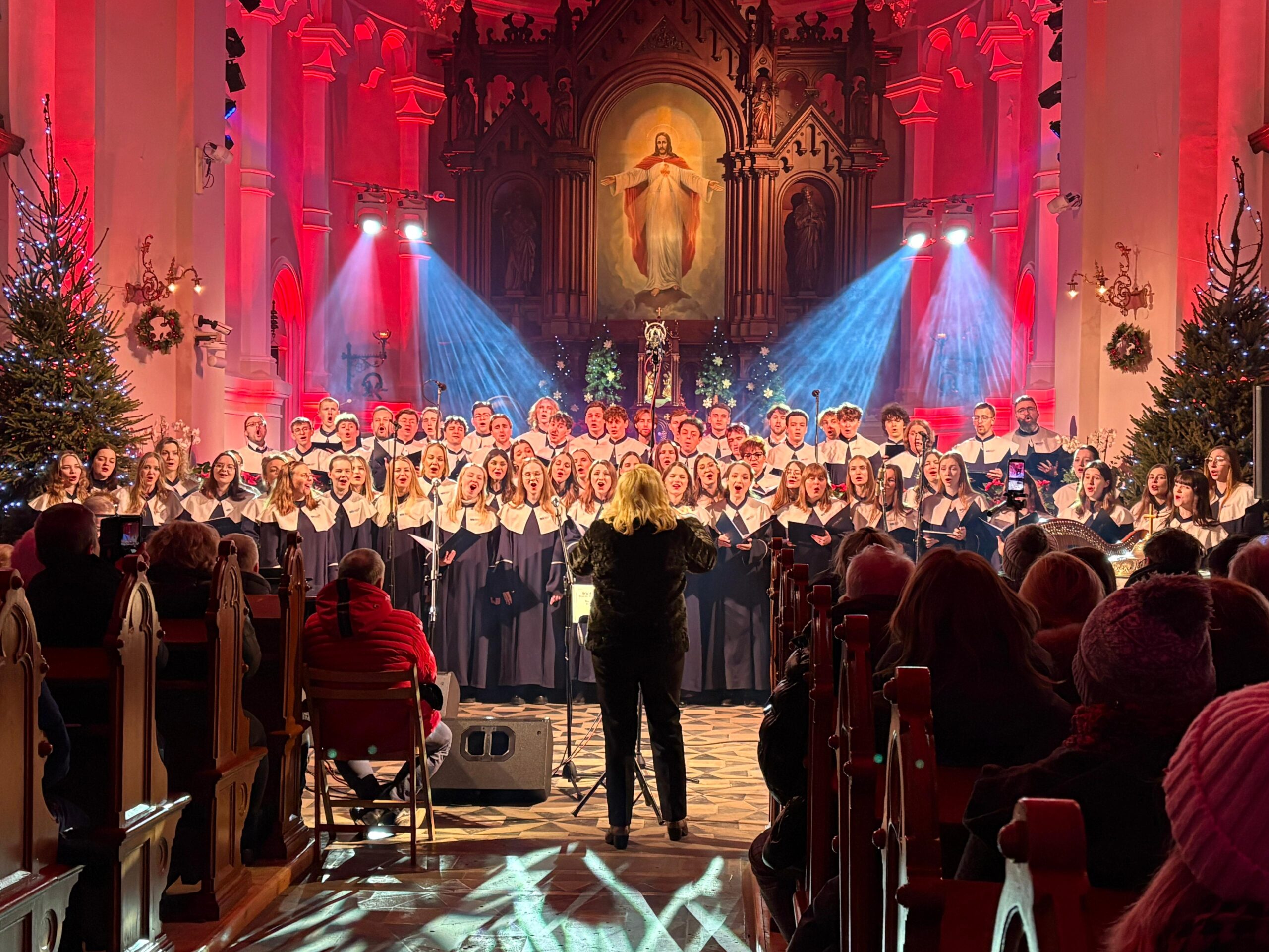 Pod batutą prof. Anny Domańskiej oraz asystentki dyrygenta Magdaleny Myjak, nasi studenci i absolwenci przenieśli słuchaczy w krainę najpiękniejszych kolęd i pastorałek. Przy fortepianie towarzyszył im Jakub Czech, a mury świątyni wypełniły się nie tylko potęgą głosów, ale i niesamowitą grą świateł, która nadała wydarzeniu niemal mistyczny charakter.
