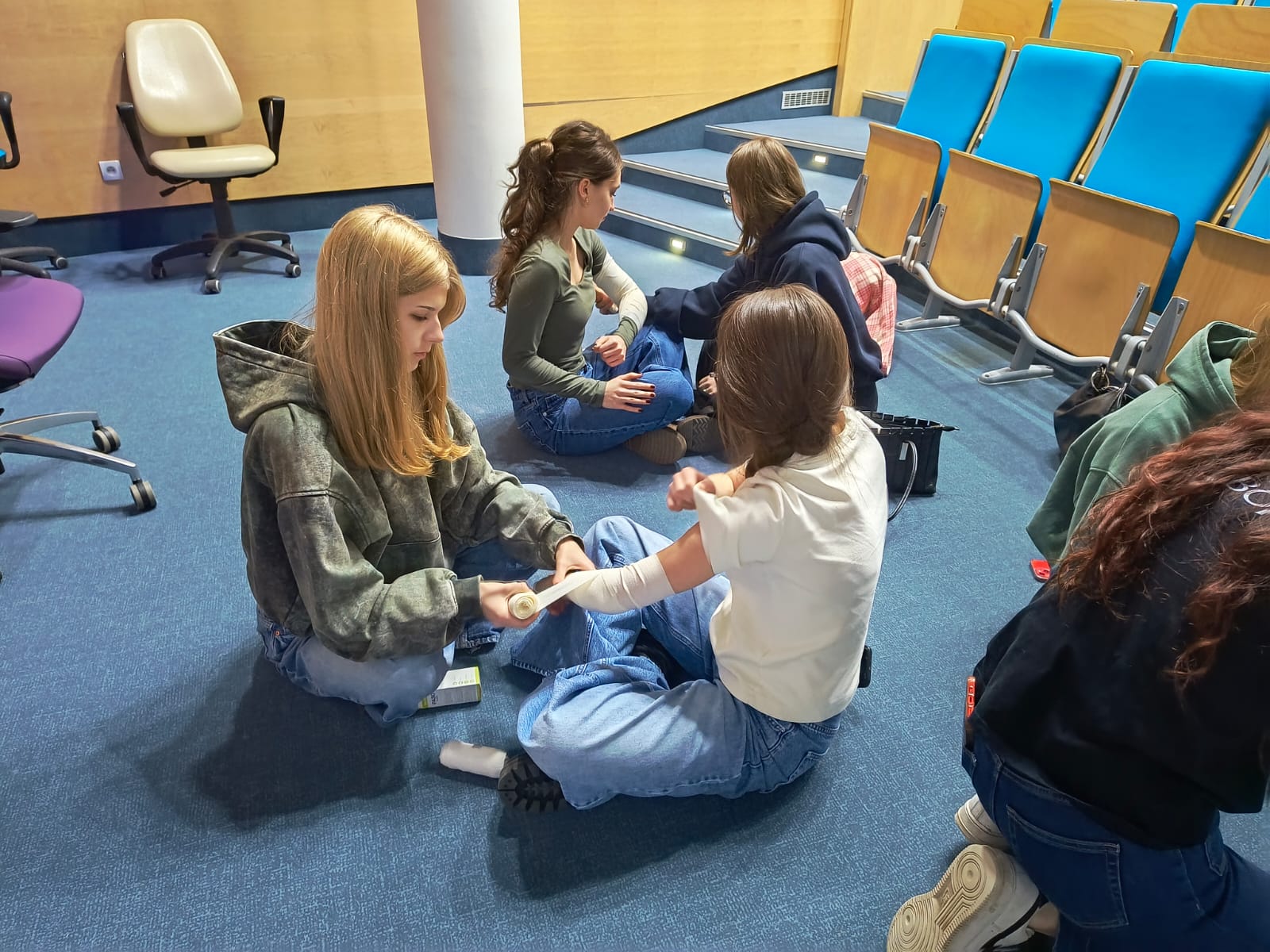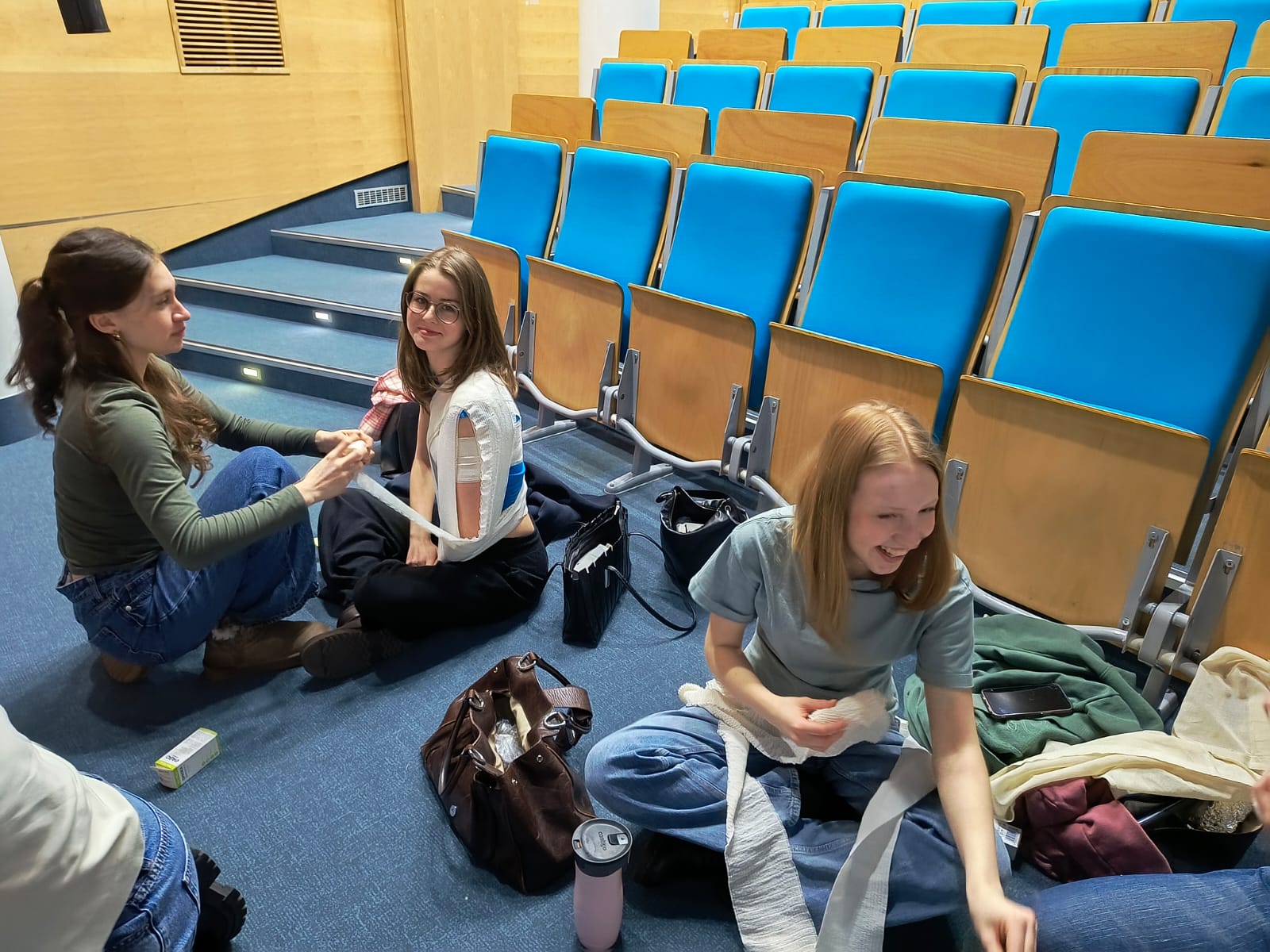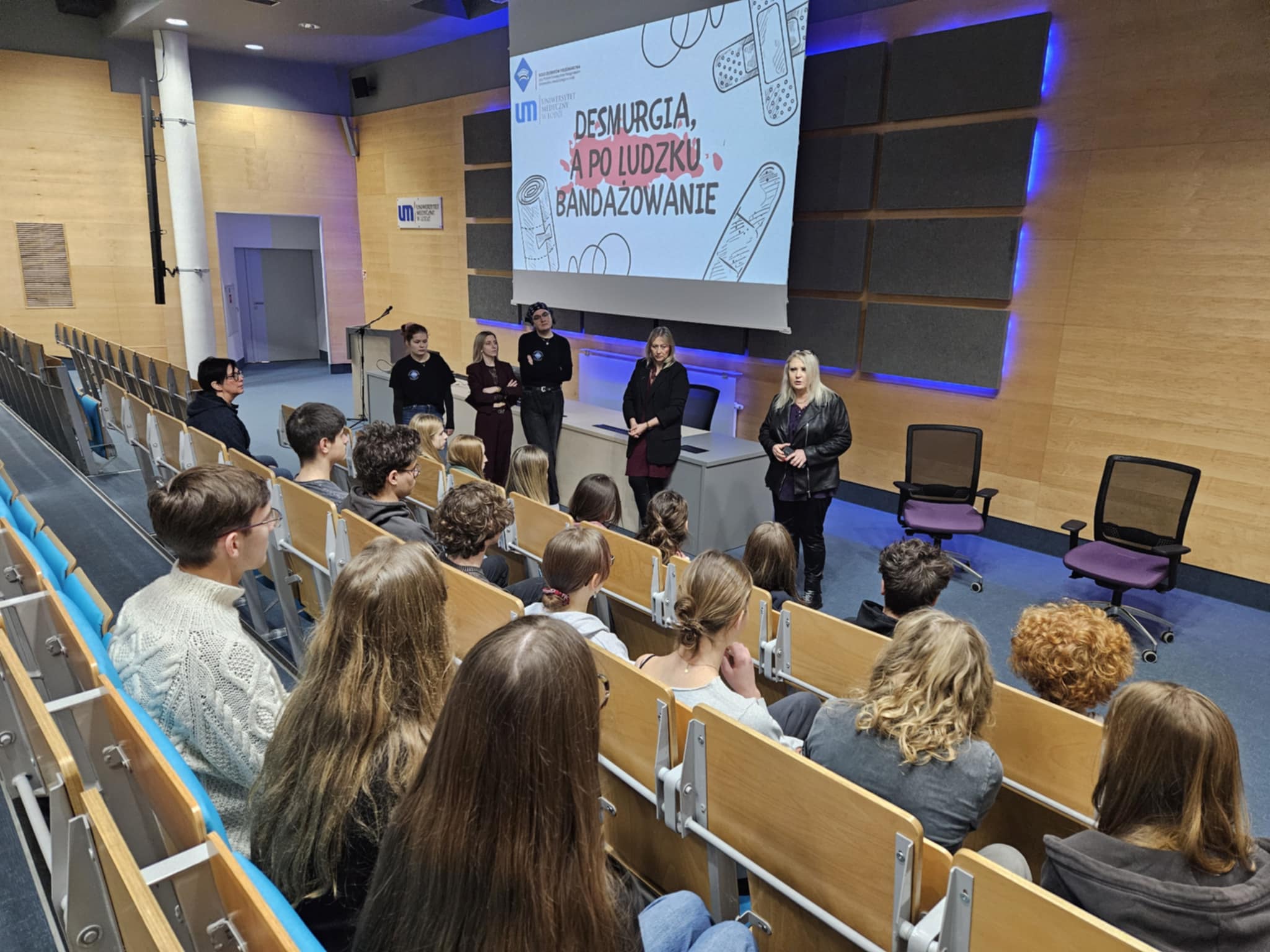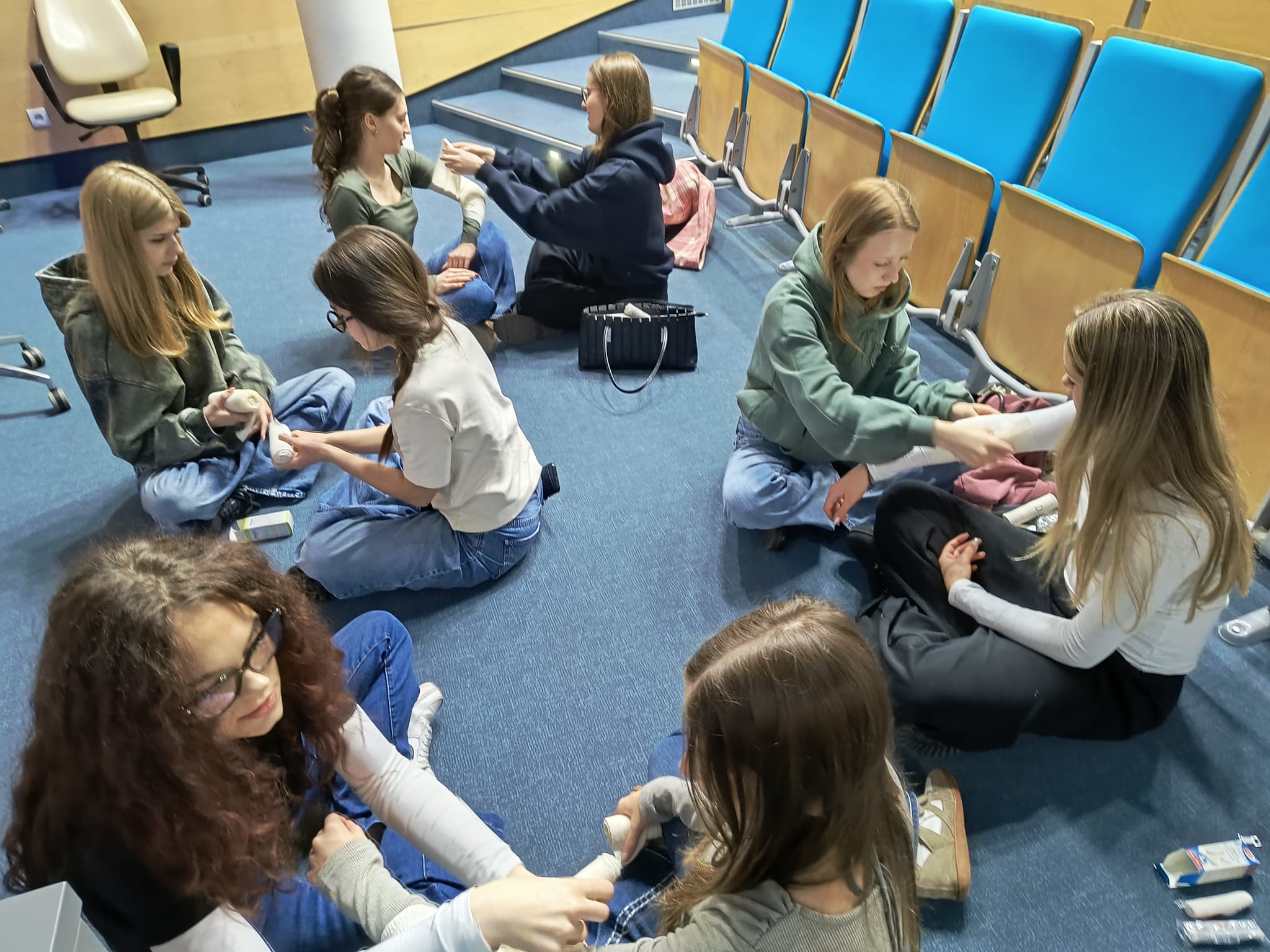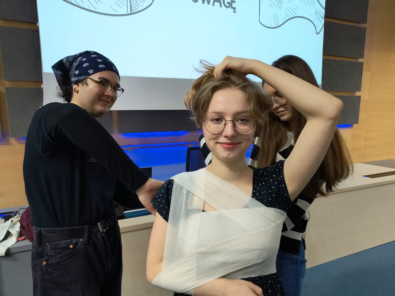 Praktyczną częścią spotkania były zachowania w sytuacjach kryzysowych na warsztatach z desmurgii poprowadzonych we współpracy z Kołem Naukowym Studentów Pielęgniarstwa pod kierunkiem Pani Doktor Katarzyny Olczak.