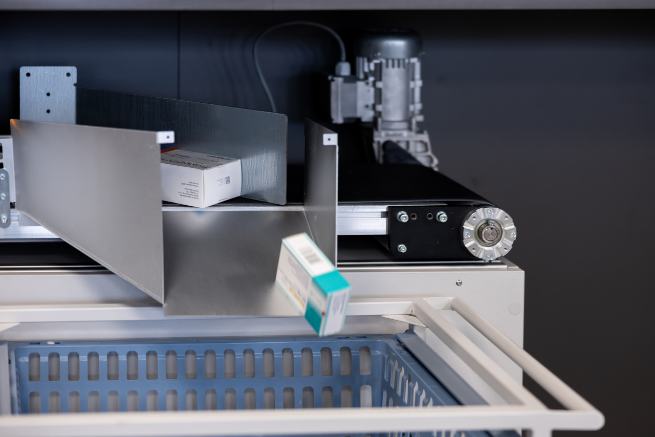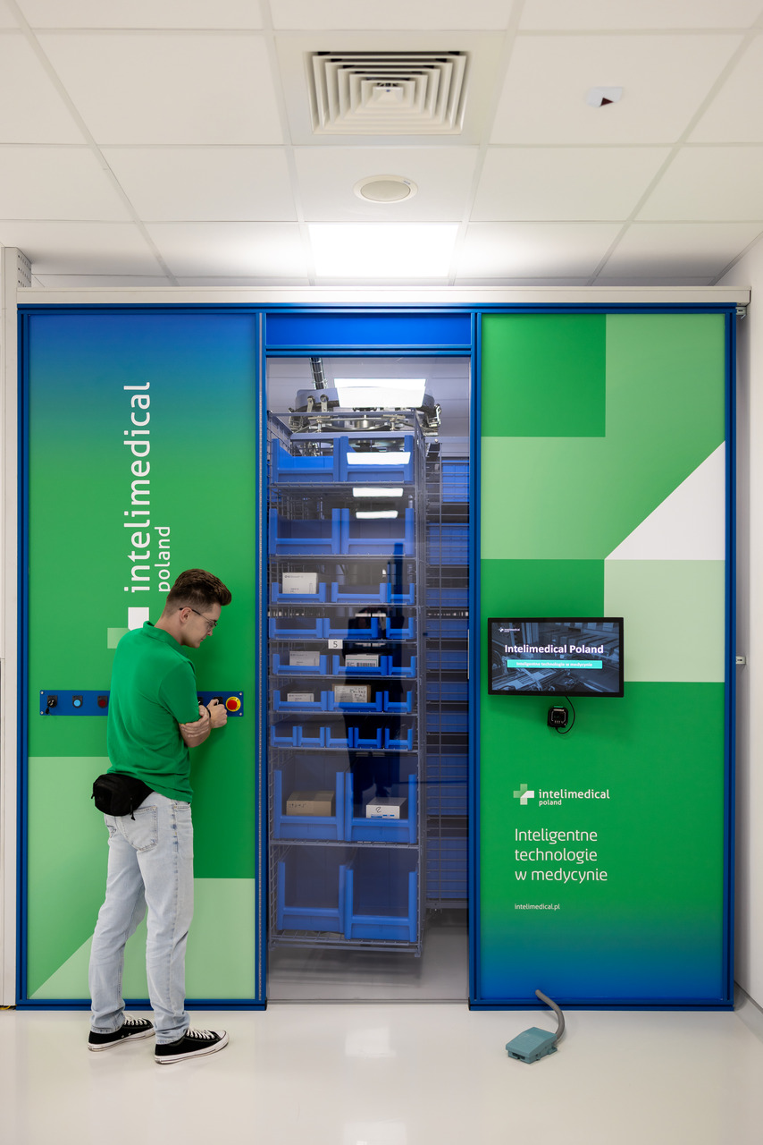 - Automatyczny magazyn leków – o pojemności do 40 000 opakowań, z pełną kontrolą rotacji, serii i terminów ważności.