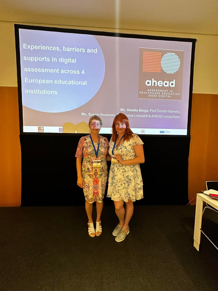 Mgr Natalia Biega z Zakładu Opieki Koordynowanej Uniwersytetu Medycznego w Łodzi oraz Susan Hourican z Dublin City University wzięły udział w sesji ustnej „e‑assessment” z prezentacją pt. „Doświadczenia, bariery i wsparcie w ocenianiu cyfrowym w 4 europejskich instytucjach edukacyjnych”. Prezentacja koncentrowała się na wnioskach z pierwszej części projektu finansowanego z programu Erasmus+, AHEAD, Assessment in Healthcare Education goes Digital (Ocena w edukacji w zakresie opieki zdrowotnej przechodzi w tryb cyfrowy”). Projekt ten ma na celu udoskonalenie praktyk oceniania cyfrowego w edukacji zdrowotnej w czterech krajach europejskich: Irlandii (lider), Niemczech, Gruzji i Polsce. Dyscypliny pielęgniarstwa, medycyny i pokrewnej opieki zdrowotnej są głównymi obszarami, a sam projekt jest skierowany do trzech kluczowych grup: nauczycieli akademickich, nauczycieli praktyków oraz osób uczących się/studentów medycyny. W prezentacji zwrócono uwagę na wyniki ankiety z pierwszej części projektu, znanego jako „Co-Creation”, którego celem było określenie poziomu zaangażowania uczniów i nauczycieli oraz ich postrzeganej pewności siebie i kompetencji w ocenach cyfrowych w uczestniczących instytucjach.