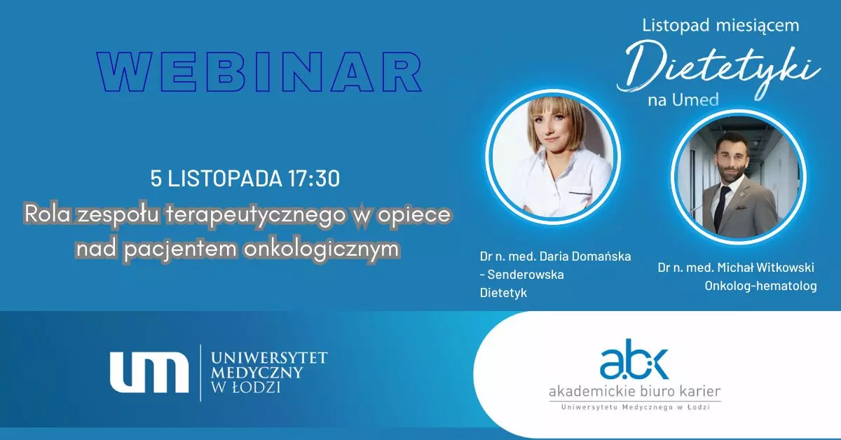 Webinar „Rola zespołu terapeutycznego w opiece nad pacjentem onkologicznym” to spotkanie łączące wiedzę medyczną i dietetyczną, prowadzone przez doświadczonych specjalistów – dr n. med. Michała Witkowskiego (onkolog-hematolog) oraz dr n. med. Darię Domańską-Senderowską (dietetyk kliniczny).