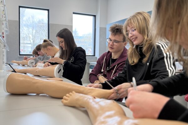 Szczególnym zainteresowaniem cieszyły się warsztaty praktyczne prowadzone przez studentów. Pierwszy z nich, dotyczący szycia chirurgicznego, został zorganizowany przez członków IFMSA-Poland Oddział Łódź, natomiast drugi, skupiający się na technikach pobierania krwi, prowadzili członkowie Koła Studentów Pielęgniarstwa przy Polskim Towarzystwie Pielęgniarskim Uniwersytetu Medycznego w Łodzi. Uczniowie mieli okazję nie tylko obserwować, ale również aktywnie uczestniczyć w zajęciach, co pozwoliło im poczuć się jak prawdziwi studenci medycyny.
