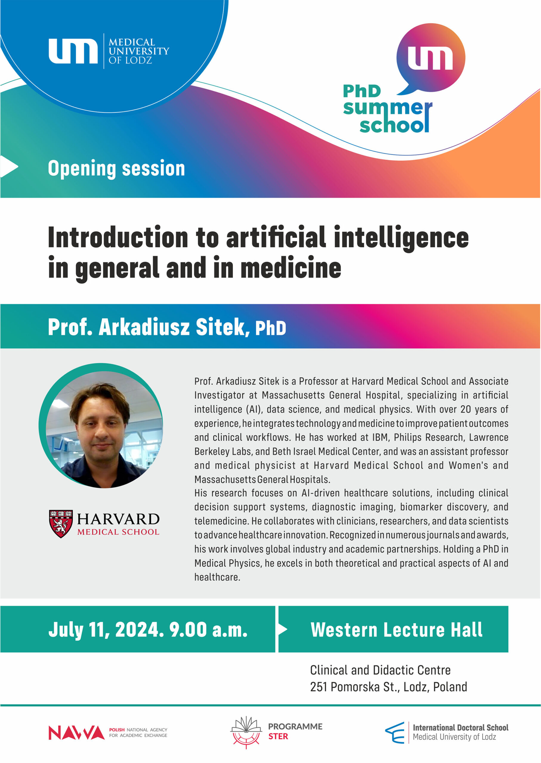 - 11.07.2024 (9:00) “Introduction to artificial intelligence in general and in medicine” Prof. Arkadiusz Sitek, PhD
