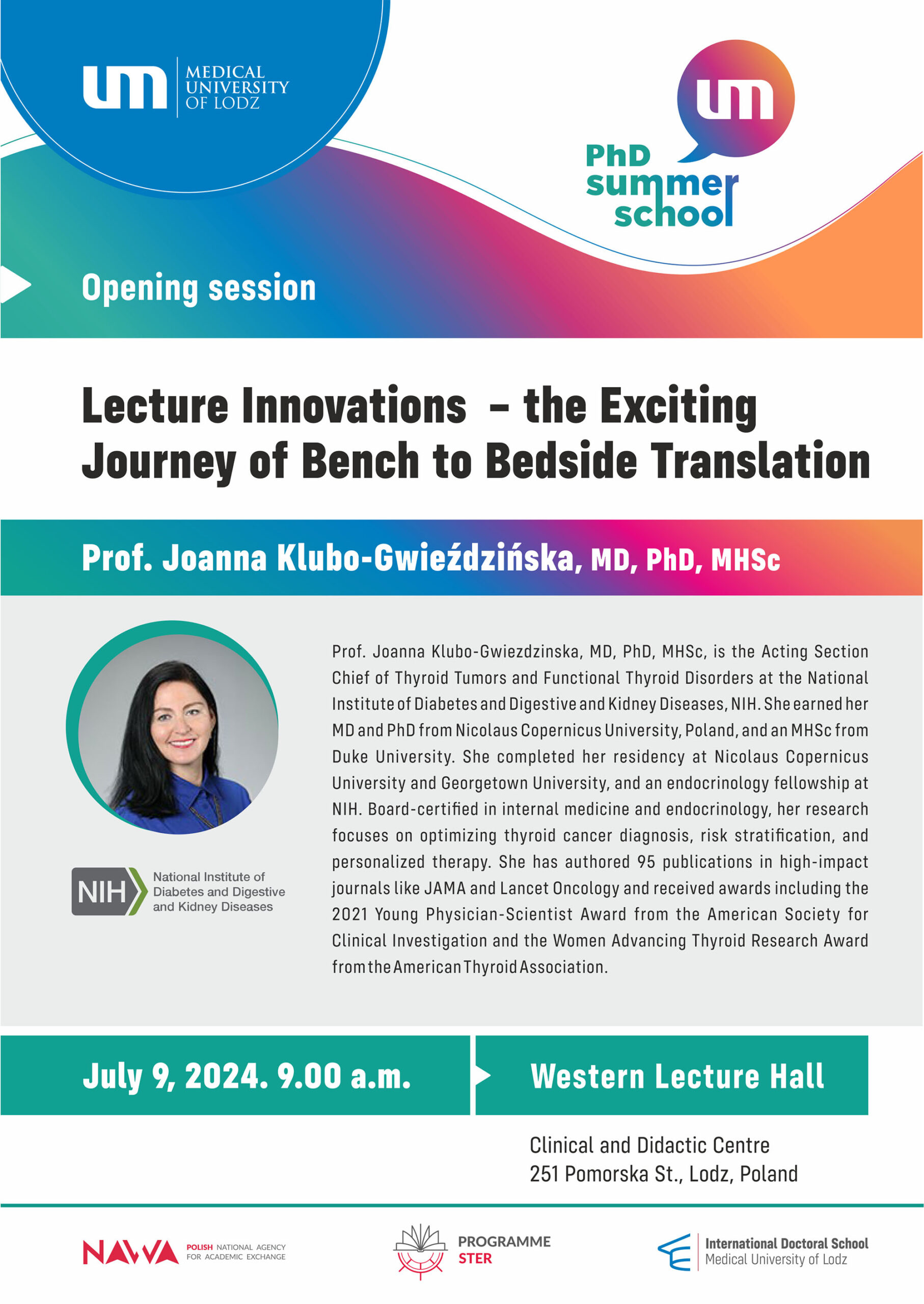 - 09.07.2024 (9:00) “Lecture Innovations – the Exciting Journey of Bench to Bedside Translation” Prof. Joanna Klubo-Gwiezdzinska, MD, PhD, MHSc